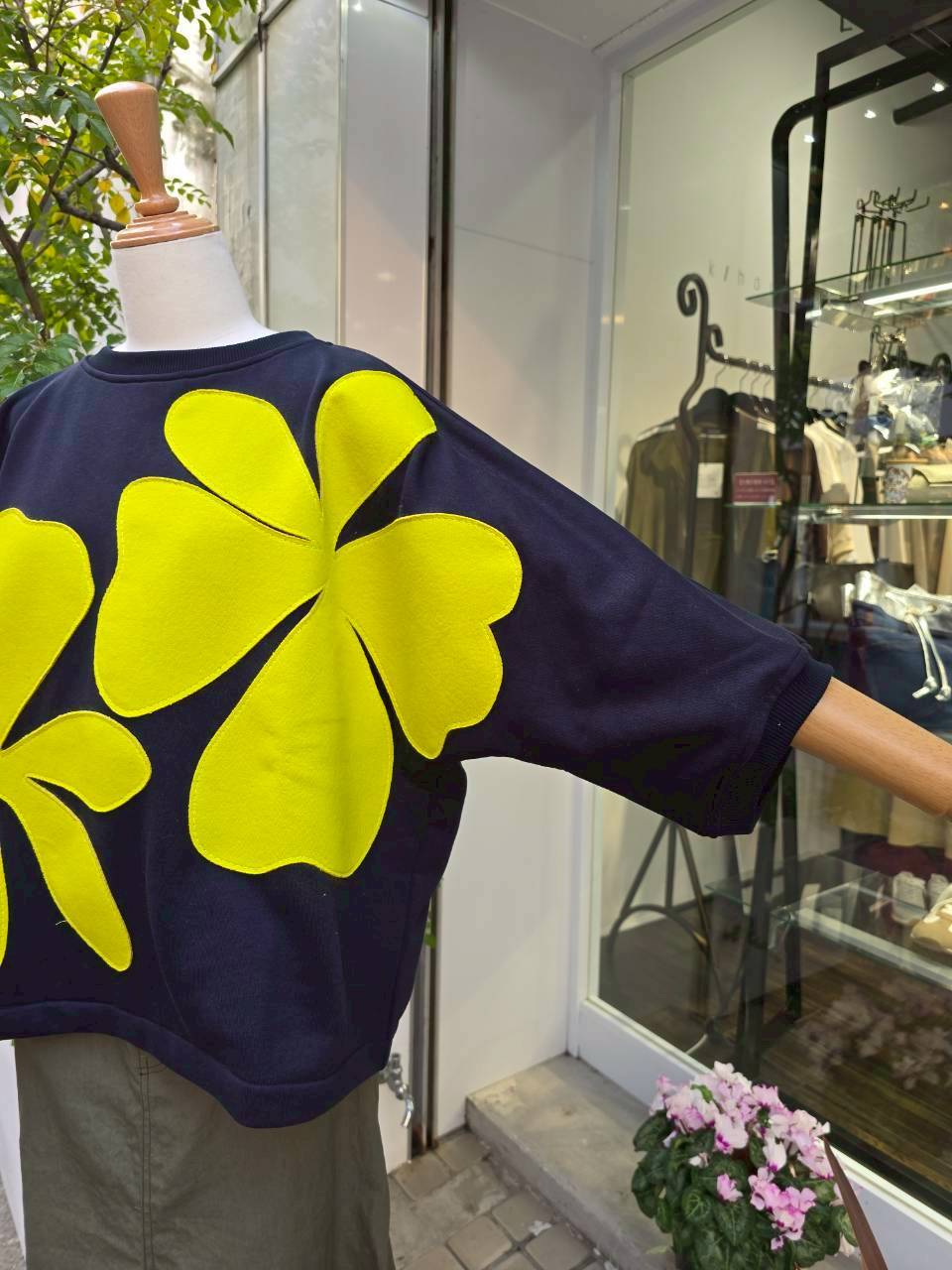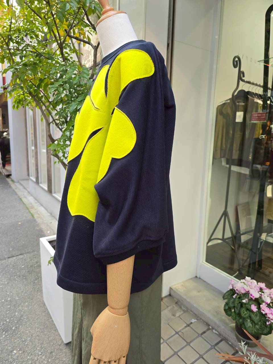 華やかなフラワーアップリケが特徴的な7分袖のトップスです。柔らかな素材を使用しているため、肌触りが良く、快適な着心地を提供します。デイリーユースにぴったりで、カジュアル個性的なスタイリングで活躍するアイテムです!