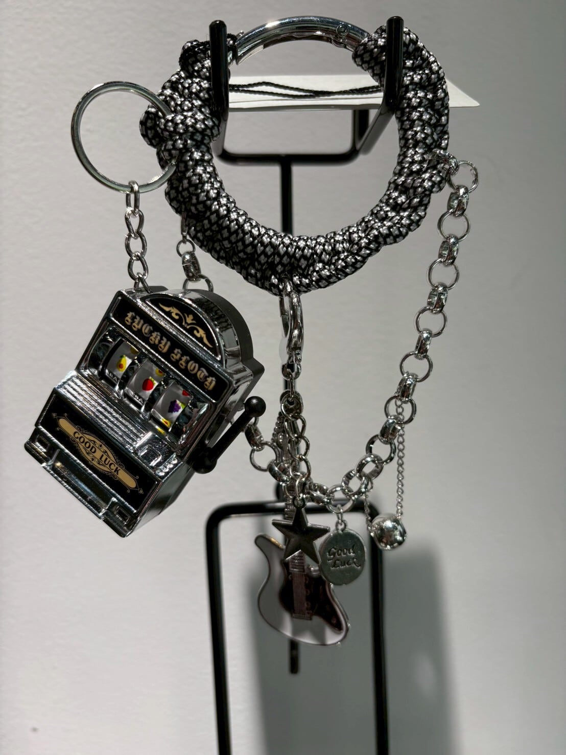 「K/house」スロット、ギターチャームは、音楽好きにはたまらないギターをモチーフにした独特なデザインのアクセサリーです。シルバーの輝きが上品で、カジュアルなコーディネートにアクセントを加えてくれます!自分へのご褒美や、大切な方への心温まるギフトとしても大変おすすめのアイテムです。シンプルなスタイルにプラスすることで、一層のおしゃれ度を引き立てることができます。